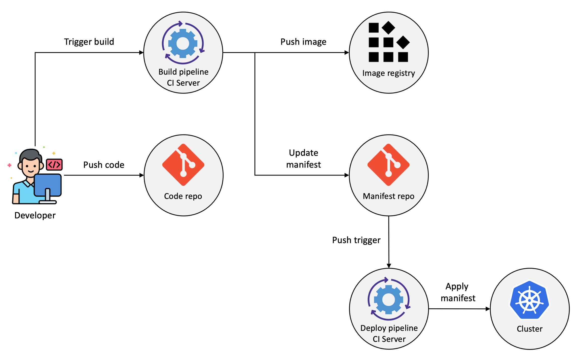 Push-based 방식은 먼저 개발자가 코드 변경사항을 git에 푸쉬한 다음, 빌드 파이프라인을 실행하면 변경된 코드를 빌드하고 이미지를 생성하여 이미지 레지스트리에 푸쉬한다. 그 다음, 관련 매니페스트 파일의 이미지 태그를 변경하여 매니페스트 파일이 저장된 레포지토리에 변경사항을 푸쉬한다. 그 다음 git push webhook 등을 이용하여 푸쉬가 발생했을 때 배포 파이프라인을 실행시킨 다음 배포 파이프라인에서 변경된 매니페스트를 쿠버네티스 클러스터에 반영한다.