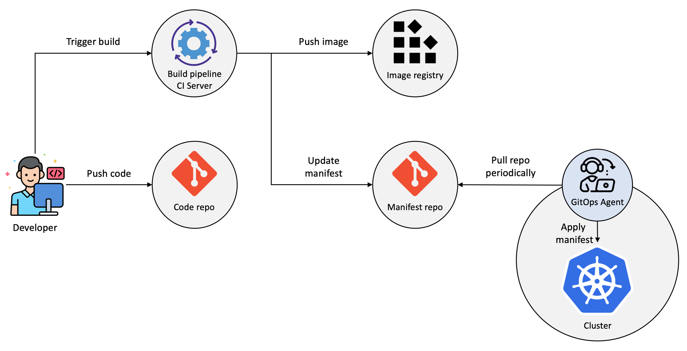 Pull-based는 Agent-based라고 하며, Push-based와 같이 개발자가 코드 변경사항을 git에 푸쉬한 다음, 빌드 파이프라인을 실행하면 변경된 코드를 빌드하고 이미지를 생성하여 이미지 레지스트리에 푸쉬한다. 그 다음, 관련 매니페스트 파일의 이미지 태그를 변경하여 매니페스트 파일이 저장된 레포지토리에 변경사항을 푸쉬한다. 그러나 실제 쿠버네티스 클러스터에 반영하는 방식이 다르다.