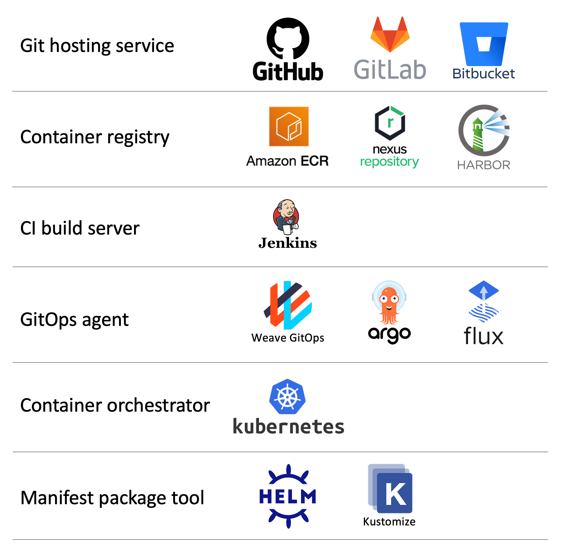 GitOps 파이프라인은 여러가지 컴포넌트로 구성된다. GitOps 파이프라인으로 자주 사용되는 툴은 다음과 같다.